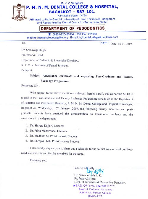 The Department has Collaboration with PMN Dental College, Bagalkot for student exchange where the students are permitted to attend various courses conducted by the Department of Pediatric and Preventive Dentistry
