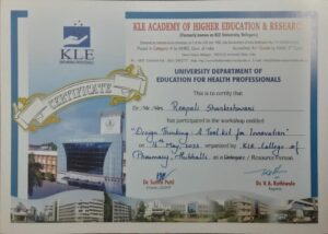Dr. Roopali Sankeshwari was invited as a resource person to a workshop on ‘Design Thinking’ organized by KLE College of Pharmacy, Hubbali on 16th May, 2023.