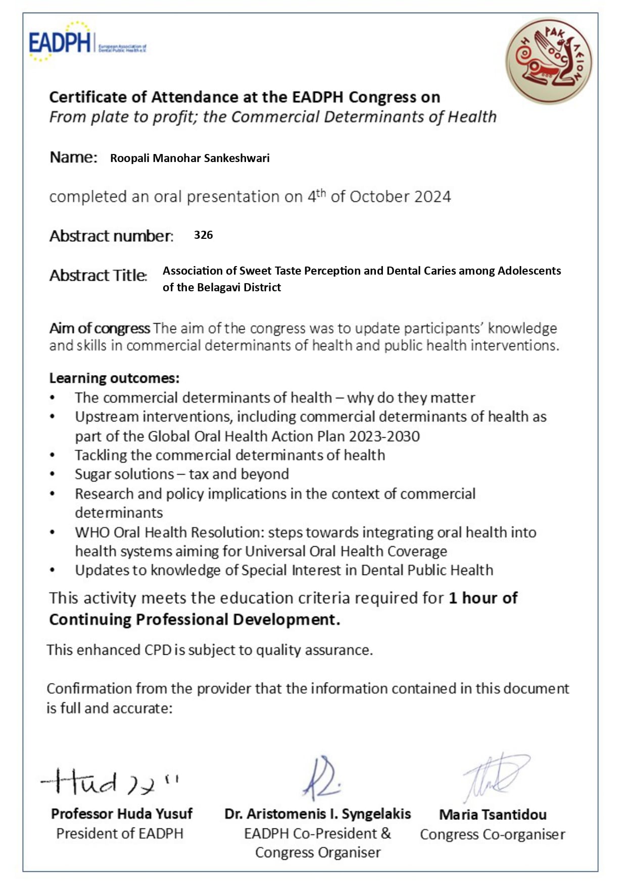 She has several best papers and more than 20 national and international publications to her credit. She is an Executive Committee member of Indian Association of Public Health Dentistry (2017-2021) and Joint Secretary of Indian Dental Association , Goa State Branch.