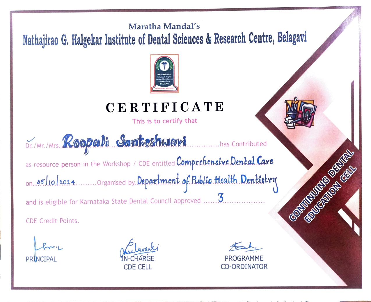 Dr. Roopali M Sankeshwari, was invited as a resource person to a guest lecture on ‘Comprehensive dental care’ organized by Department of Public Health Dentistry, Maratha Mandal’s Nathajirao G.Halgekar Institute of Dental Sciences & Research Centre, Belagavi.